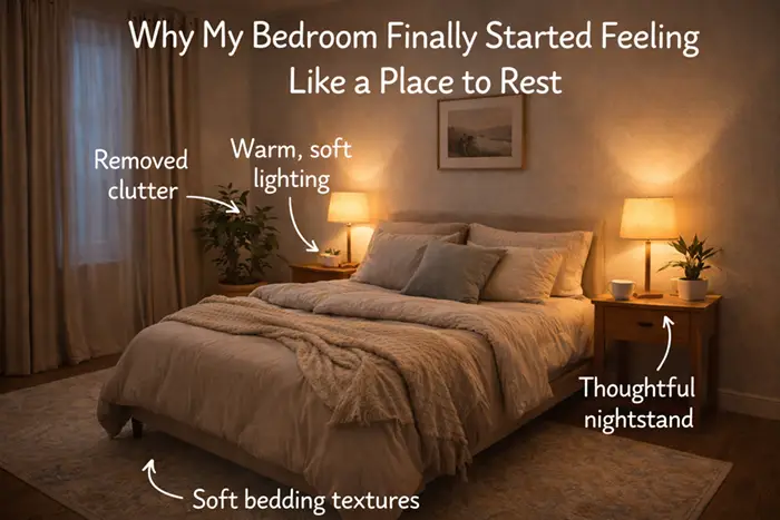 What surprised me was how small the changes were. Fewer items. Gentler light. Softer textures. Each adjustment lowered the room’s energy just enough to invite rest instead of resistance.